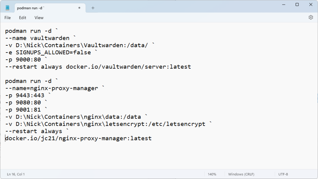 Containers are created (and recreated) using the ‘podman run’ command. Rather than type these in manually each time, we recommend setting up text files inside which you store commands like so: